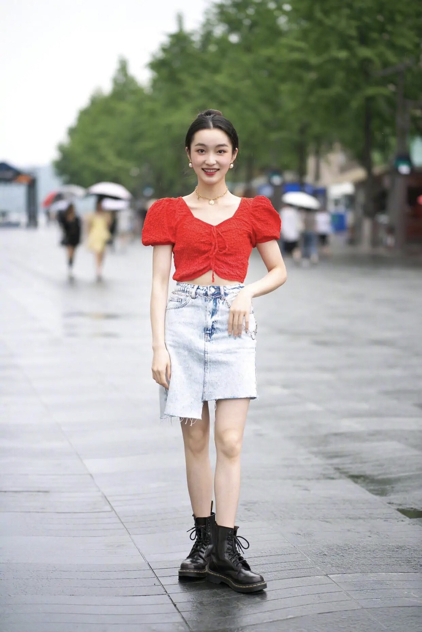 对于年轻的时髦精而言,我们今年夏天可以选择一款这种带有不规则裙摆设计的款式,这种参差错落的设计样式,相比较一刀切的款式而言,穿起来更加灵动吸睛。只是这时候选择鞋子,就需要是这种纯色款的小巧皮靴了,鞋腰不能过高,否则会抢了半身牛仔裙的存在感。而我们选择的牛仔裙,也要是这种浅色系的为好,能够与深色的鞋子之间形成色彩差距,让你的造型十分高街洋气。