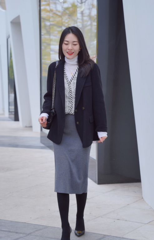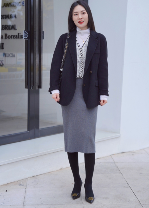 这位博主选择了黑色西装搭配灰色毛呢半身裙,时尚度很高。短款西装和高腰的半身裙结合起来也是非常显瘦显高的,小个子就应该多尝试这样的穿搭。