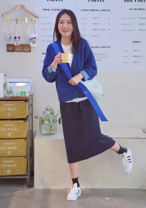 下面这位博主选择白色的毛衣开衫搭配黑色包臀半身裙,用经典的黑白配凸显出了她自身的时尚魅力,看上去很时髦,脚下搭配着黑色的平底乐福鞋,也特别舒适和耐看,日常生活中就这样穿吧。
