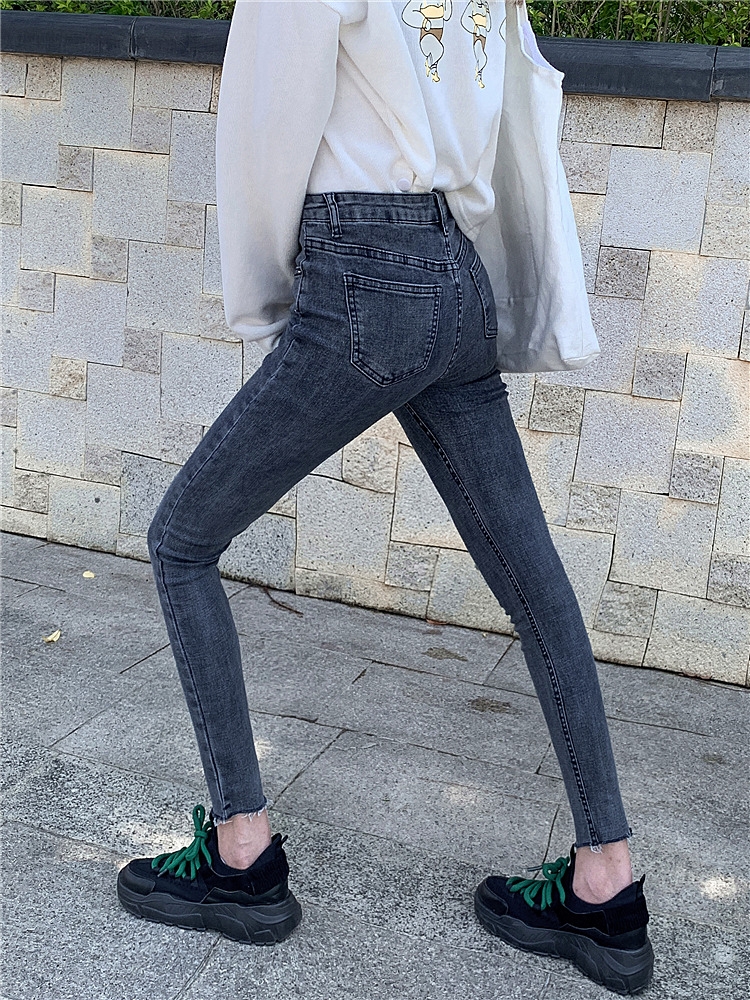 灰蓝色是现在牛仔裤特别流行的一款颜色,裤子的裤脚没有收边,采用了毛边设计,增加了不少时尚度。九分的长度正好将脚踝露出,拉长身高的效果非常好。裤腰的双纽扣设计起到很好的装饰效果。