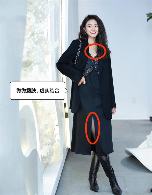 选择在锁骨,手腕,大腿这些不影响整体保暖效果的部位选择小面积局部露肤,或半透明轻薄材质的单品。