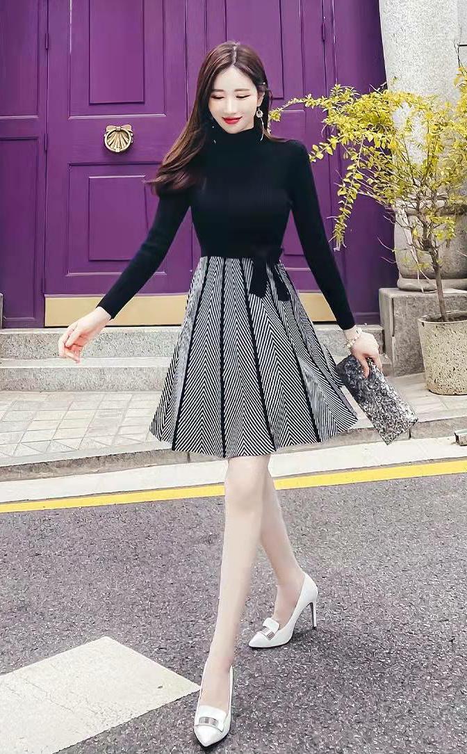 A字裙的设计,黑白的色调混搭,搭配一条系带的蝴蝶结,衬托出满满的女人味。看起来非常的淑女穿搭。精致优雅时尚靓丽。