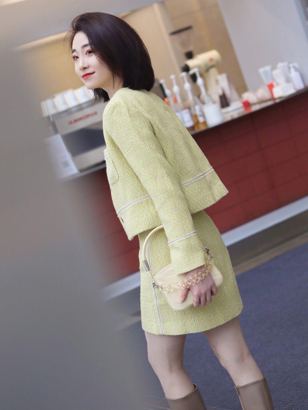 这一整套的颜色非常柔和,而内搭挑选纯白色更加和谐,白色与淡黄色组合在一起,有一种相得益彰的美。博主选择的内搭并不是那么保守,融合了v领设计,秀出了骨感身材。长袖小香风外套难免会让人觉得沉闷,这个时候内搭稍微性感一点,不容易出错,还会更有妩媚感。