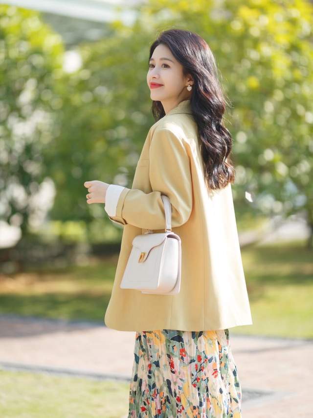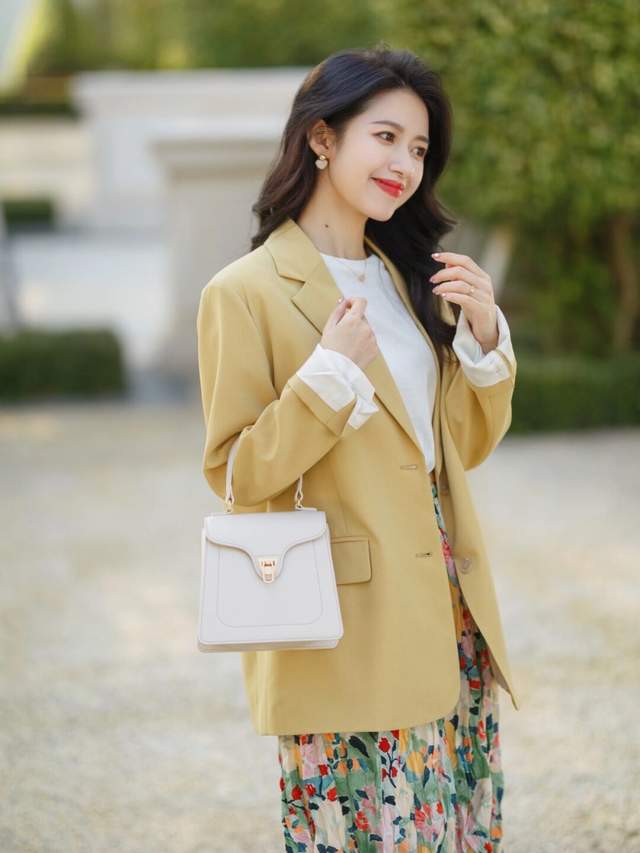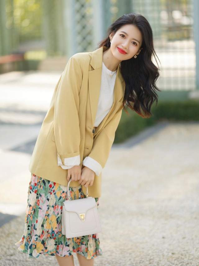 想要有点女人味,又有点气质感的话,这样的穿搭超级适合,还非常地清爽洋气,这样的印花百褶裙非常地有时尚元素,西服外套本来是有点正式感的,但是被博主这样搭配起来,好像有休闲中又带着时髦感了。