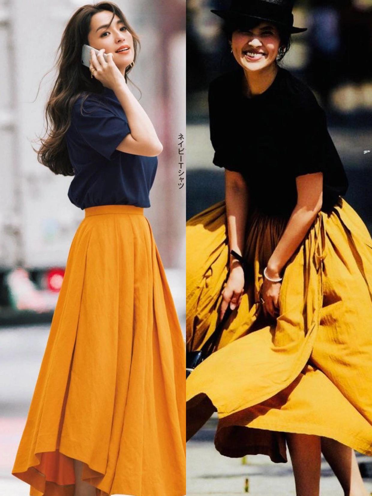 半身裙的配色会对整体风格产生较大的影响,如果你气质出挑,想要快速脱颖而出,那就试试暖色调的半身裙,暖色调本身就是不容人忽视的存在。其中,黄色是最明亮温暖的颜色,它会让人联想到热情的太阳,显白大气,还很提气色,与半身裙结合后,就非常方便凹造型了,对穿搭者的身材也不会有太高的要求。