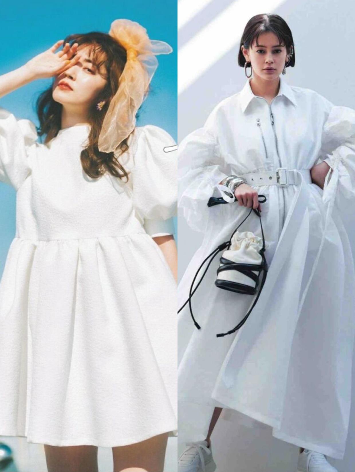 白色与黑色处于两个极端,代表着清纯与干净,适合用来营造仙女风的气质,也能与所有元素进行搭配组合。带有泡泡袖、灯笼袖设计的白色连衣裙看起来会更有公主风的气质,它会很好的修饰手臂线条,对身材的包容性不错,也不会太浮夸,日常出行完全可以穿。