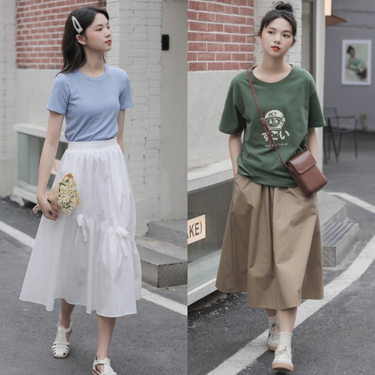 look2:亮色T恤+基础色半身裙
