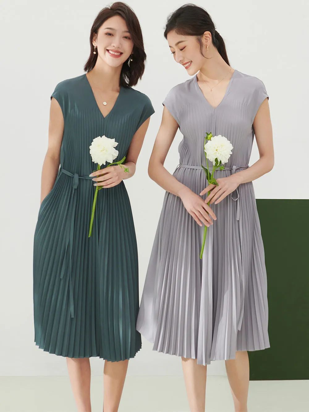 当然,百褶裙除了有半身裙之外,还有连衣裙。简约的V领无袖百褶裙,轻轻松松便穿出了优雅女人魅力。