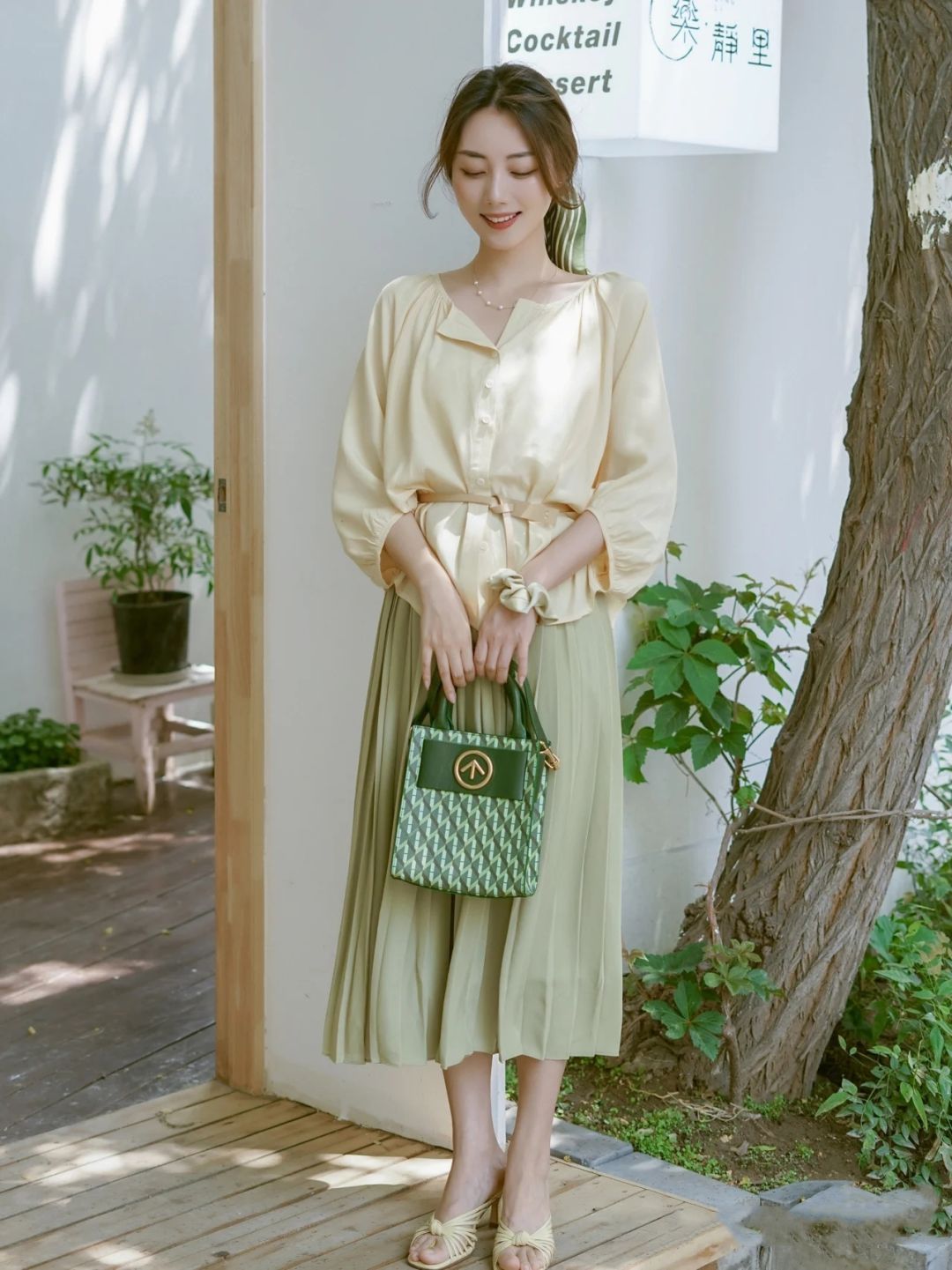 百褶裙的裙型较为特殊,因为层次感比较强,所以穿搭出来的风格也十分多变。卡其色衬衫,搭配浅绿色百褶裙,随性自然地穿搭,却穿出了大方优雅的女人魅力。