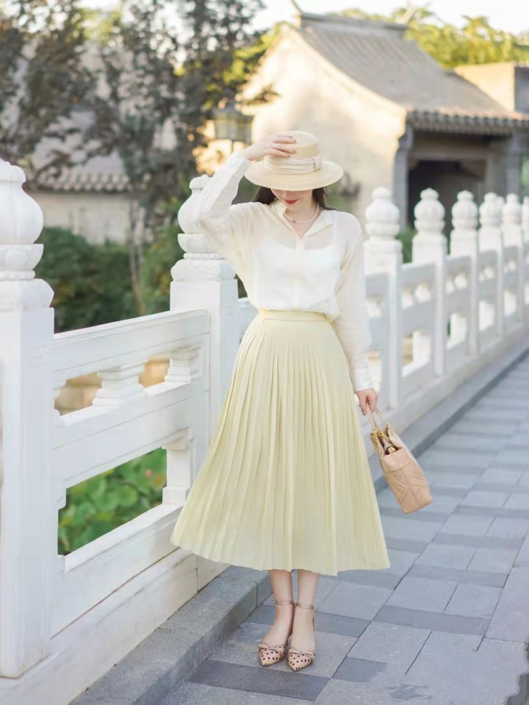 又或者是透视感薄衬衫,搭配同样的浅色系百褶裙穿搭。宽松的上衣,配上高腰A字百褶裙穿搭,清新文艺,减龄优雅,让人有一种甜甜的初恋感觉。