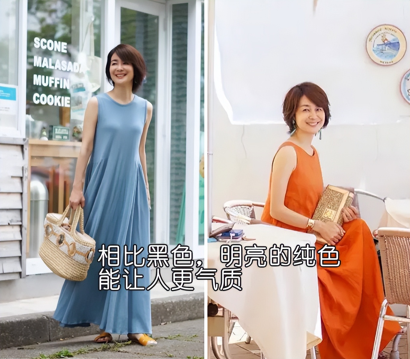 前面说纯黑色不适合,主要就是因为颜色会让整个人看上去无精打采的。那么此时比较好的备选项就是选择明亮的纯色,比如说像蓝色、淡黄色、淡橘色等等。注意颜色选择浅淡一点的会更显气质哟~▲