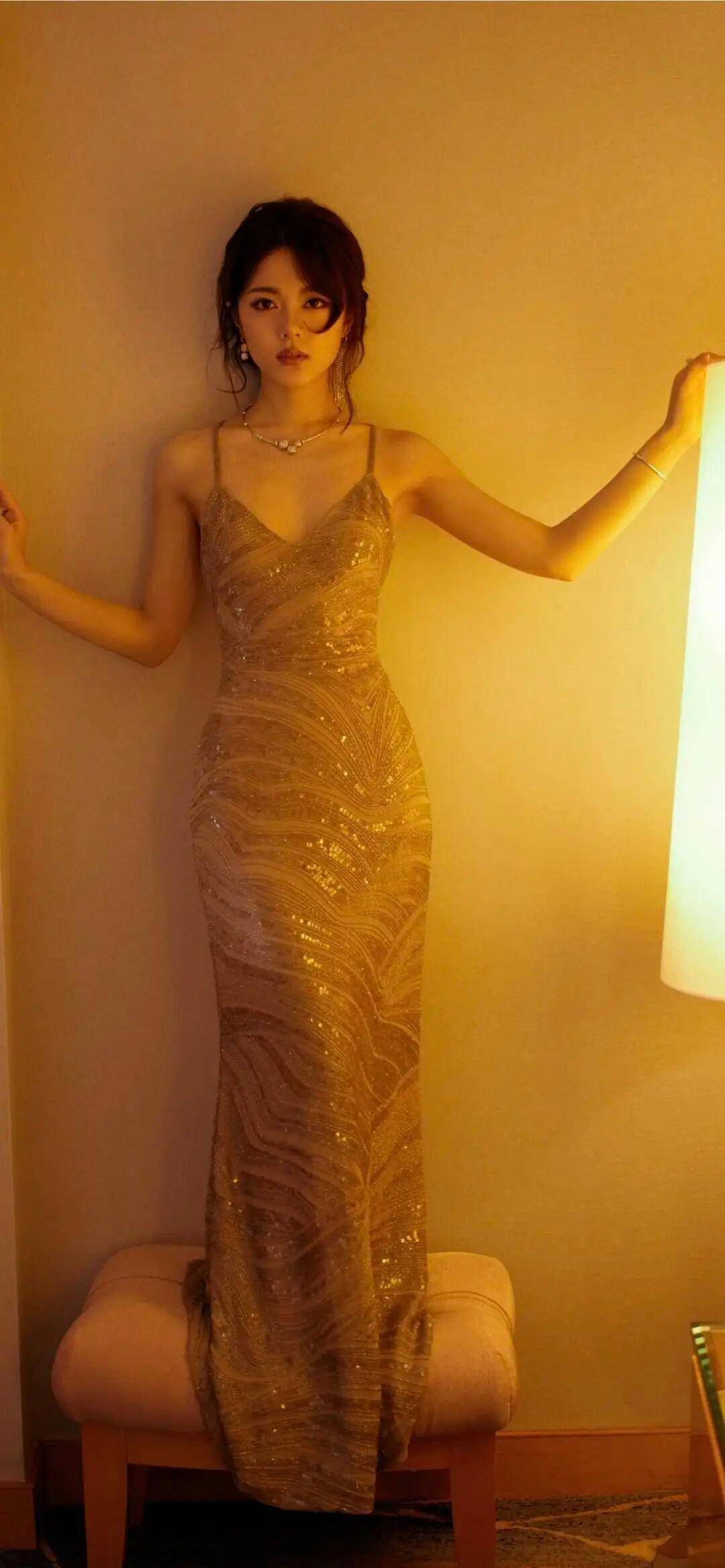 这件礼服的设计可以说是 “小心机” 满满,浅咖色的亮片面料在不同光线下呈现出不同的光泽感,波浪形的纹路更是为其增添了几分灵动。修身的版型将赵今麦的身材包裹得恰到好处,细吊带和深 V 领的设计,大胆又不失优雅,将她的肩颈线条和锁骨曲线完美展现,每一次转身都能让人感受到她身姿的优雅与曼妙。