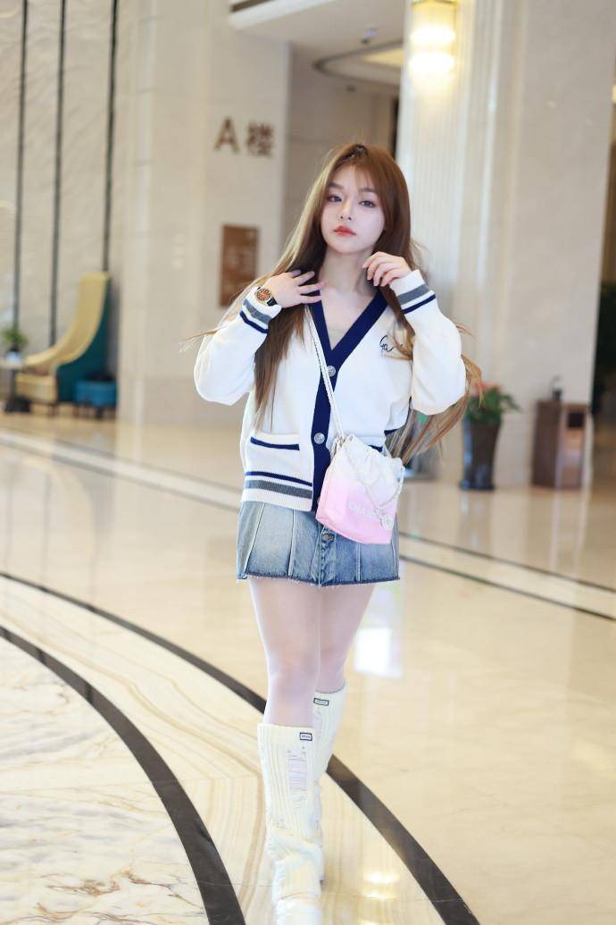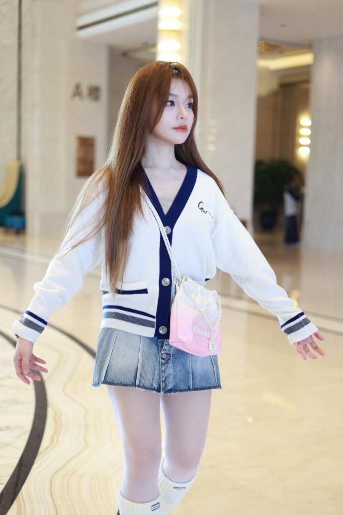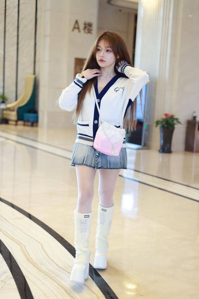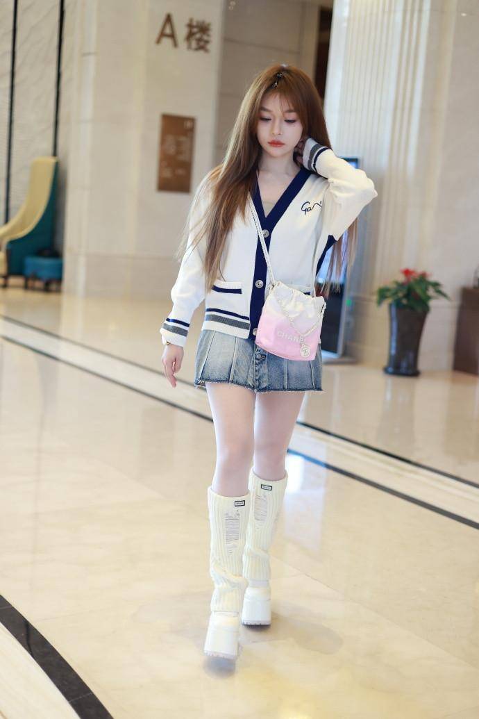 这身穿搭中,白色与藏青色的经典学院配色,简约又不失活力。针织开衫的柔软材质,贴合身形,展现出她纤细的上身线条。短款的设计,更是巧妙地拉高了腰线,让她的双腿看起来更加修长。搭配的牛仔短裙,长度恰到好处,既展现了她的美腿优势,又增添了几分俏皮感。脚上的白色厚底长靴,不仅与上身开衫颜色相呼应,还进一步拉长了腿部比例,让她的身材看起来更加高挑。而粉色渐变链条包的点缀,则为整体造型增添了一抹甜美气息。