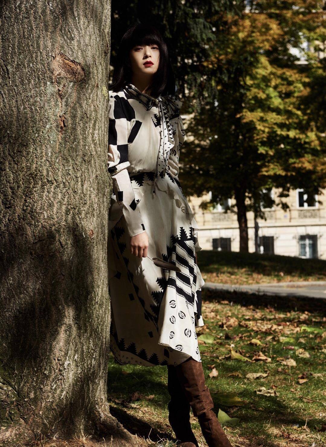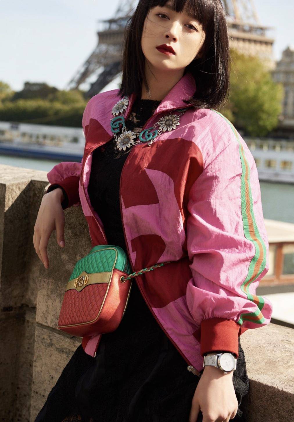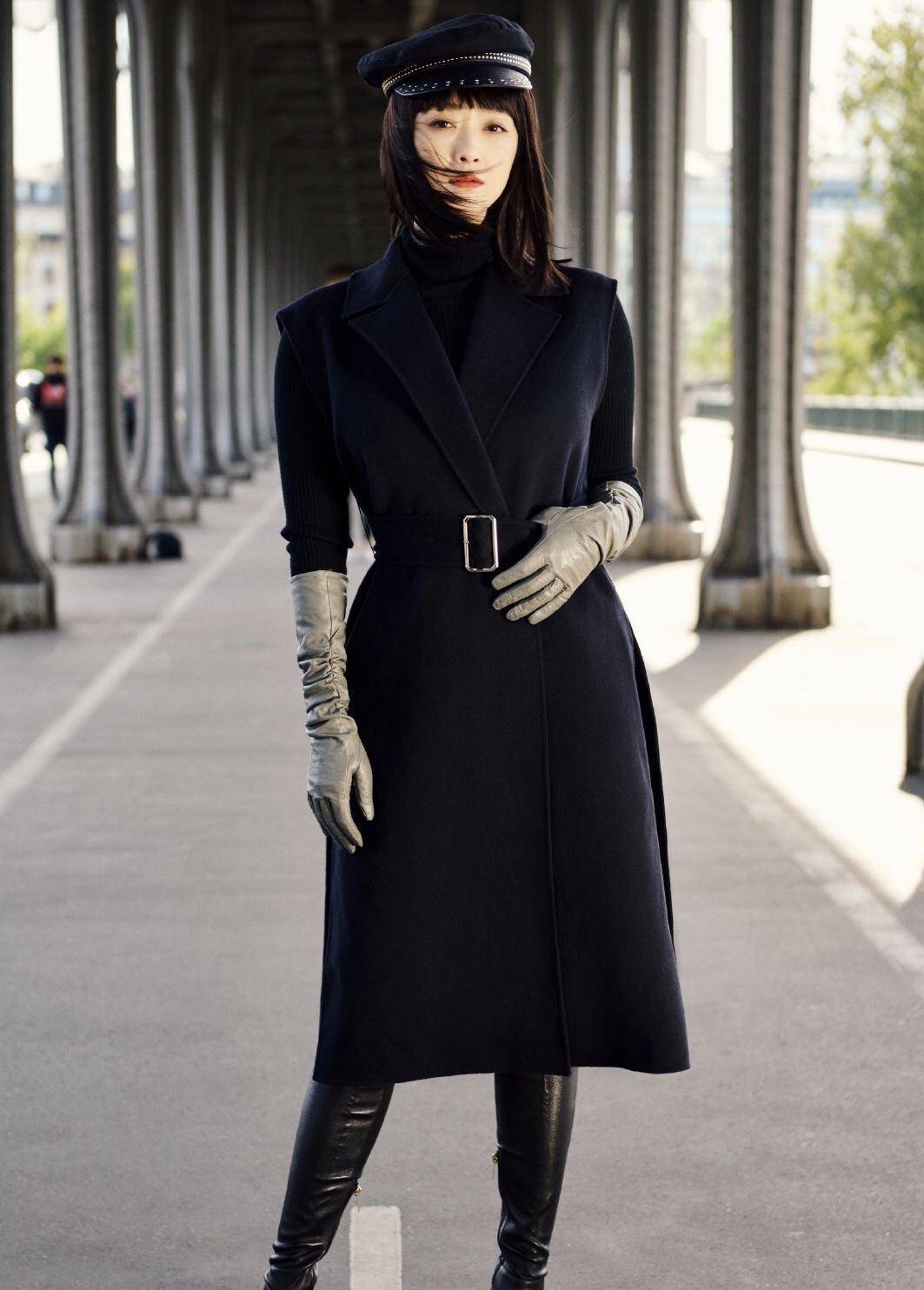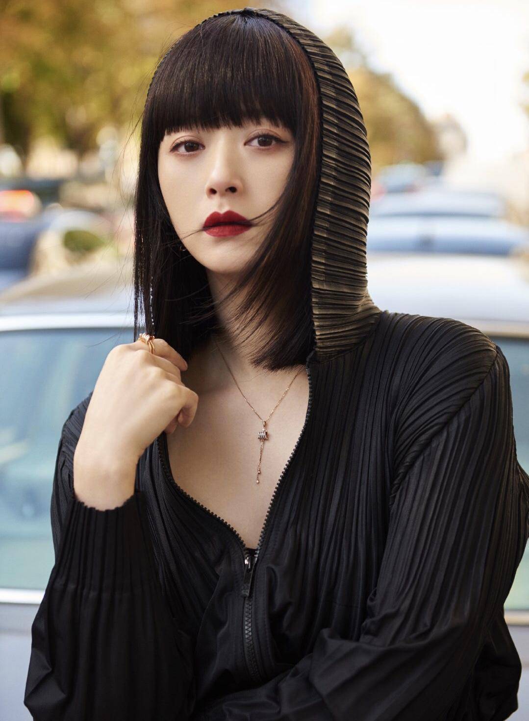 上衣存在褶皱,其具备飘逸以及灵动的特质,穿于身上不会致使人们产生紧的感觉。黑色带有神秘的效果,极为契合蒋欣这个年龄段的女性。当穿着外套之际,拉链能够向低拉一些,如此便能营造出较为性感的造型,进而彰显锁骨。另外还能够搭配一条项链,使得整体看起来更具光泽感 。
