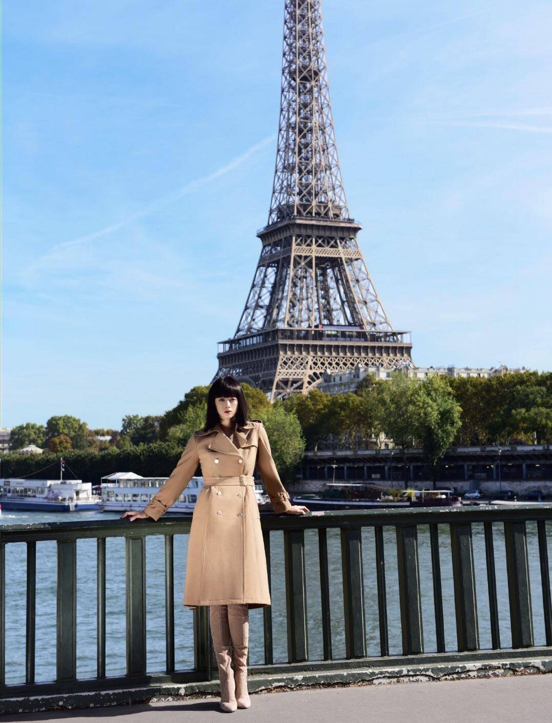 蒋欣瘦了超任性,大衣长筒靴街拍,齐刘海冷艳又高级
