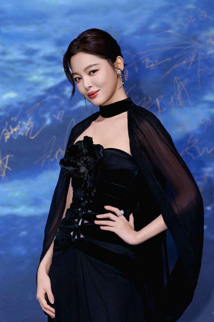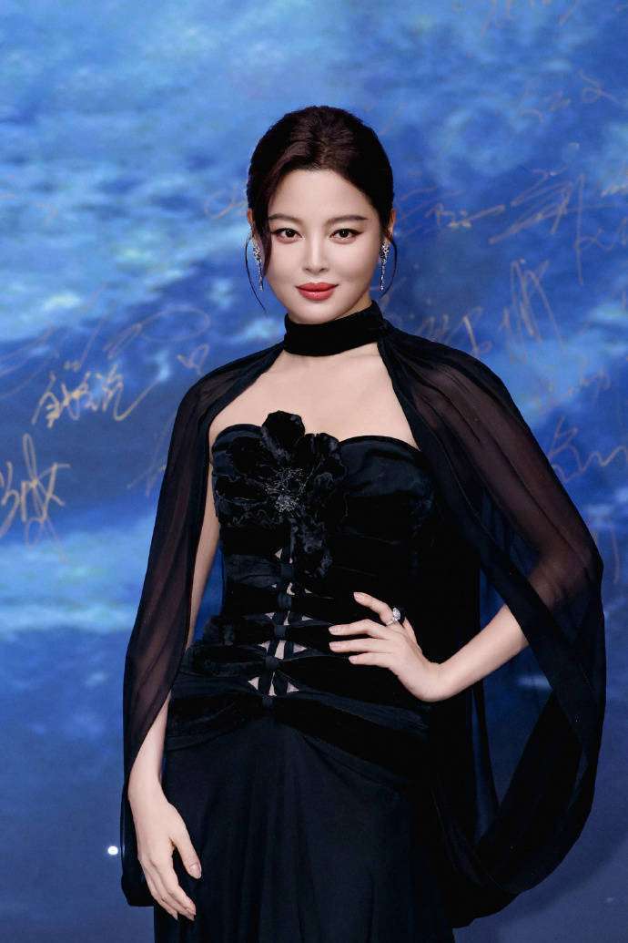 第一款穿搭出现在微博之夜,是一款黑色抹胸长裙。辛芷蕾凭借这款裙装向我们诠释了低调中的极致奢华——她在红毯上的冷艳气场可谓无与伦比。裙装的材质采用了丝绒与薄纱的拼接设计,营造出丰富的层次感。丝绒的哑光质感低调而贵气,正好衬托出她那种优雅冷艳的气质。轻盈的披风式外层设计,则为整体造型增添了一丝神秘感和流动感,仿佛从深海中走出的暗夜精灵。细节处,立体花朵的装饰与暗黑玫瑰的意象相呼应,使得整套造型更加生动。尤其是披风的垂坠感,营造了一种哥特式优雅的视觉冲击力,增添了几分戏剧性。