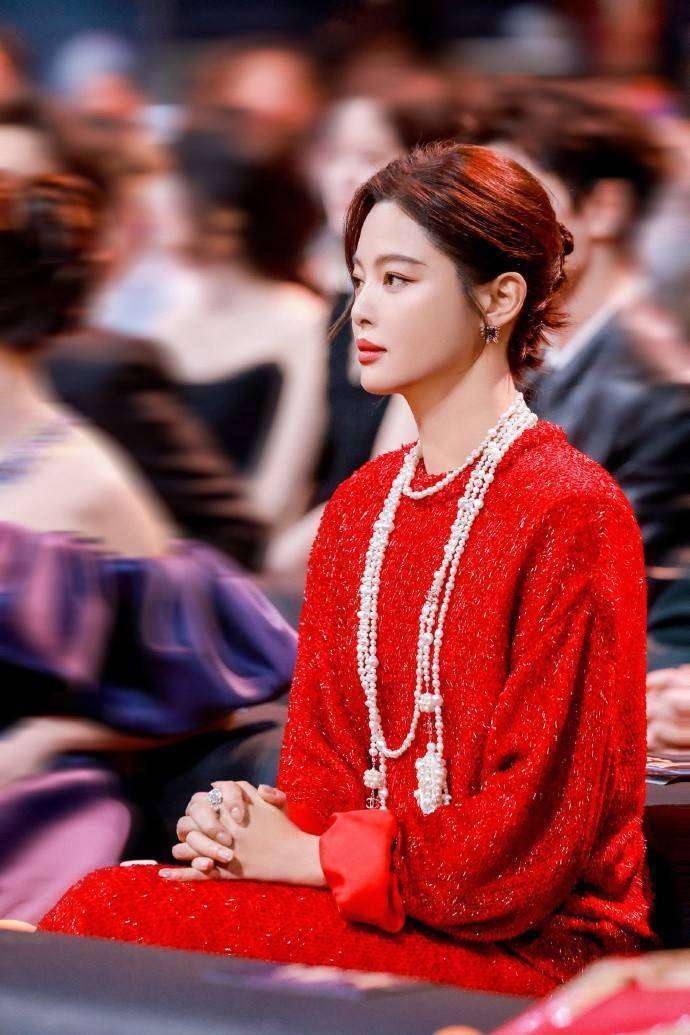 第二款穿搭同样出现在微博之夜,辛芷蕾换上了一款红色亮片开衩长裙。这套造型融合了端庄与摩登,散发着强烈的现代气息。裙装的设计非常具有辨识度,上身是宽松廓形的针织开衫,下身是修身的A字半裙,整体采用红色亮丝编织面料,在灯光下流转着珠光般的细腻光泽,仿佛无数颗微小的星辰在流动。裙装的正统中国红,不仅没有浮夸之感,反而恰到好处地展现了东方女性的自信与力量。