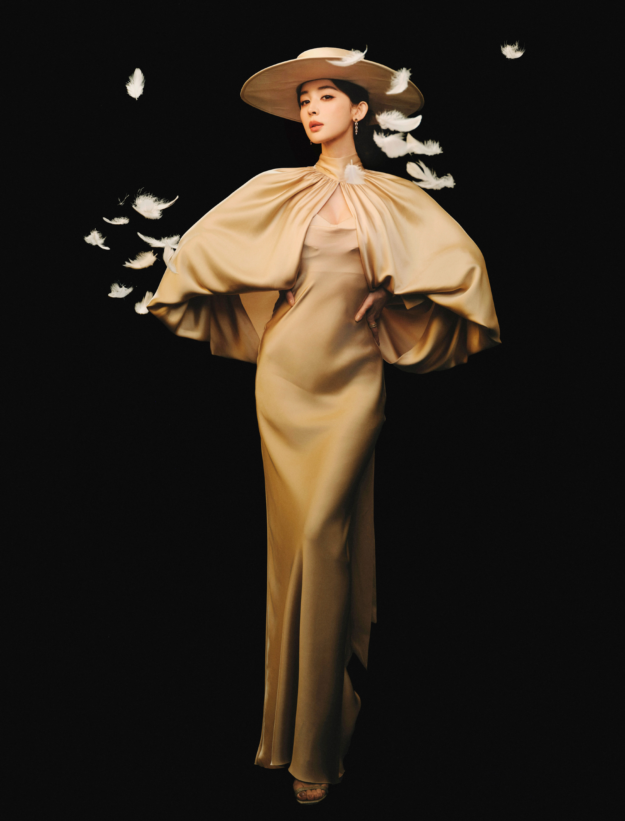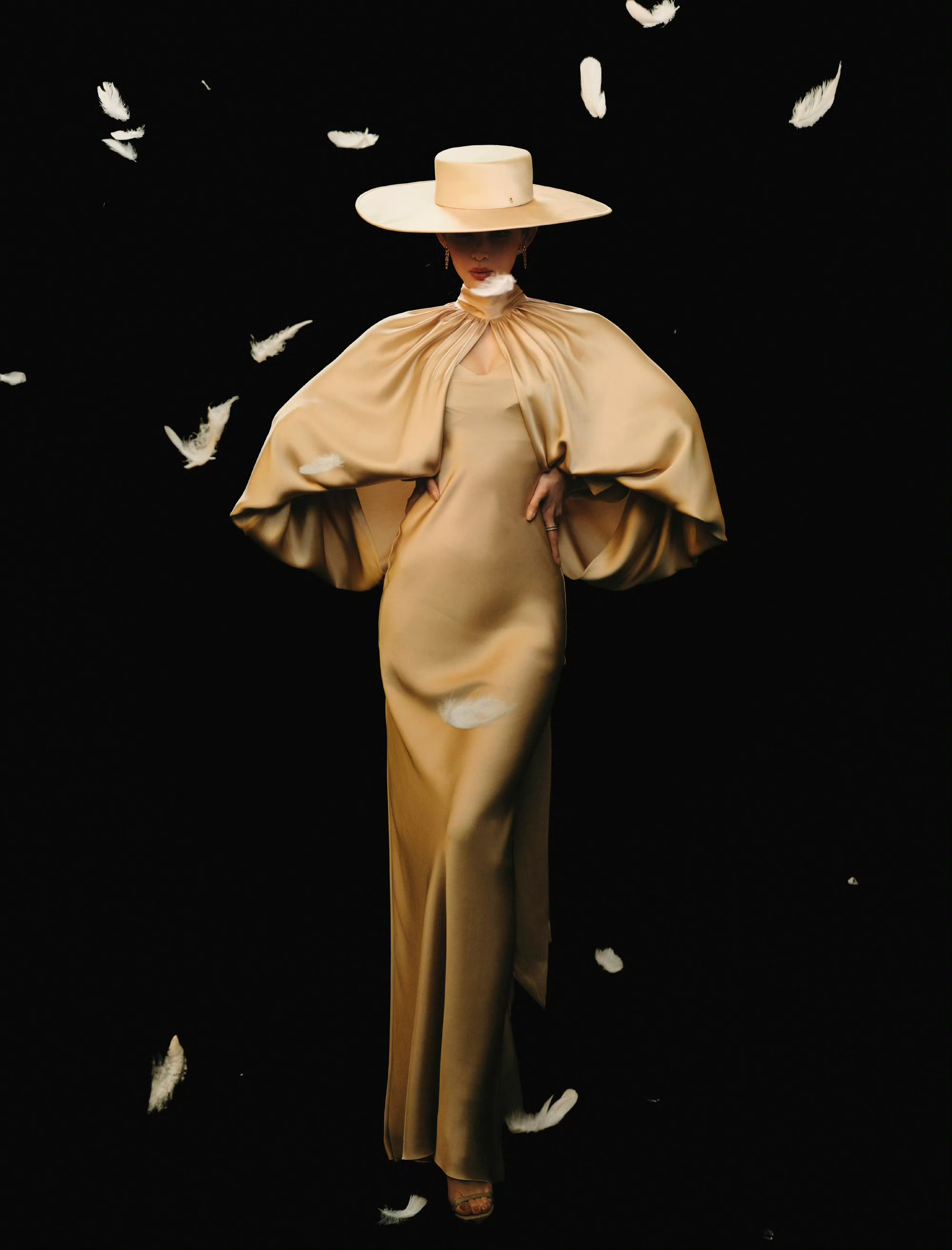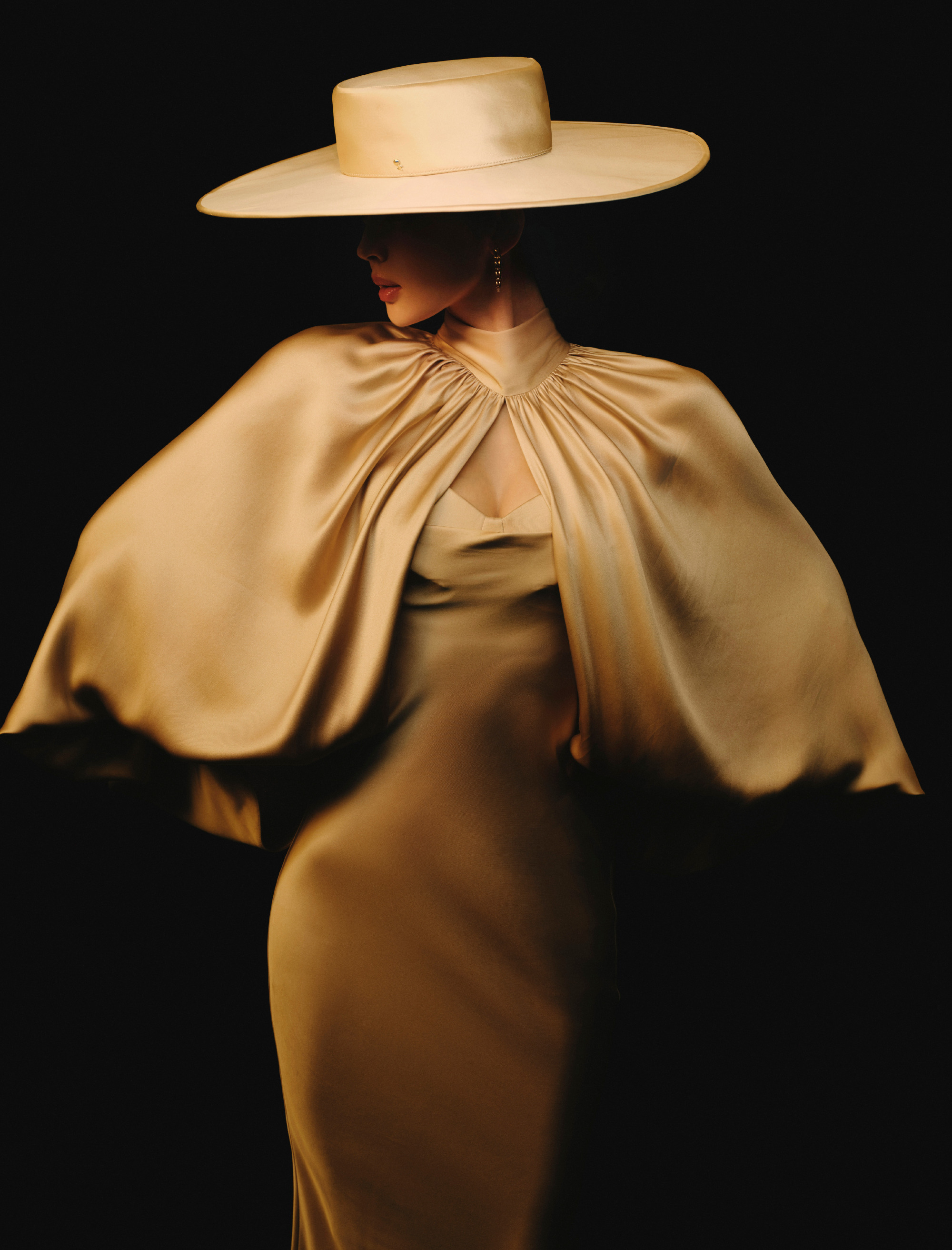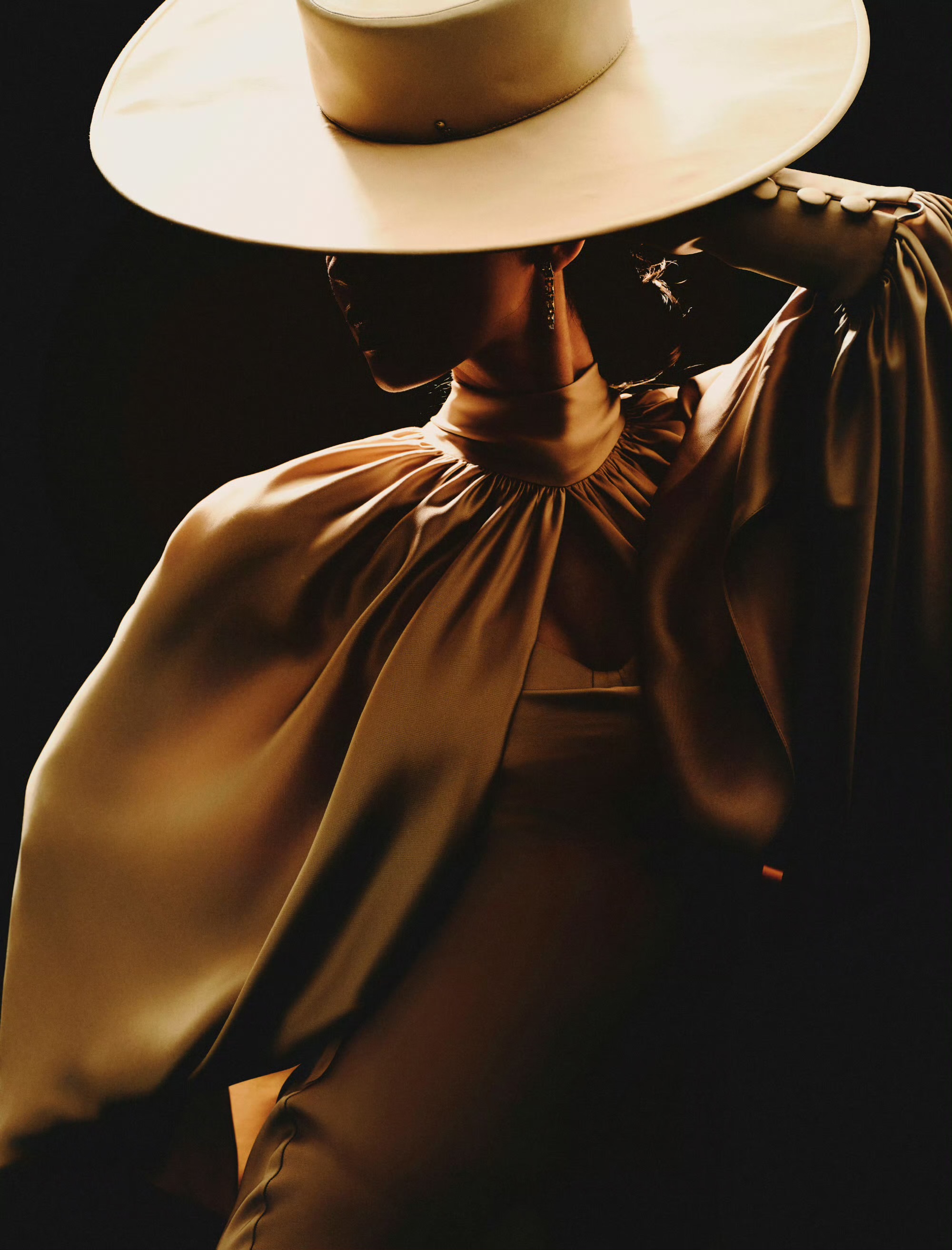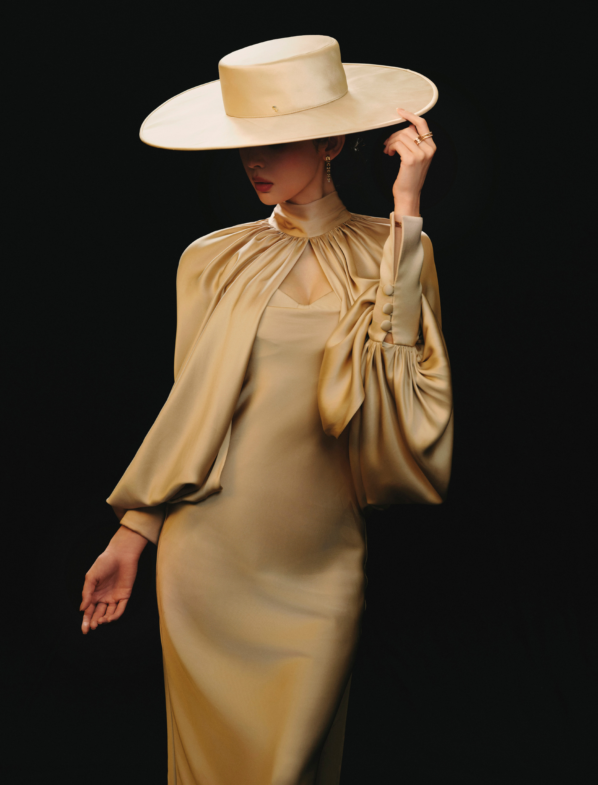 同色系宽檐礼帽是整套造型的点睛之笔,半遮面的帽檐为造型蒙上朦胧神秘感,完美呼应“魅影”主题。金色链条配饰以冷硬金属质感中和缎面的柔婉,为整体注入疏离锋芒。娜扎明艳又清冷的气质与造型完美契合,在柔光暗调之间,既有香槟般温润的优雅,又藏着不被定义的锋利气场,成就了一组氛围感与设计感双双拉满的时尚大片。