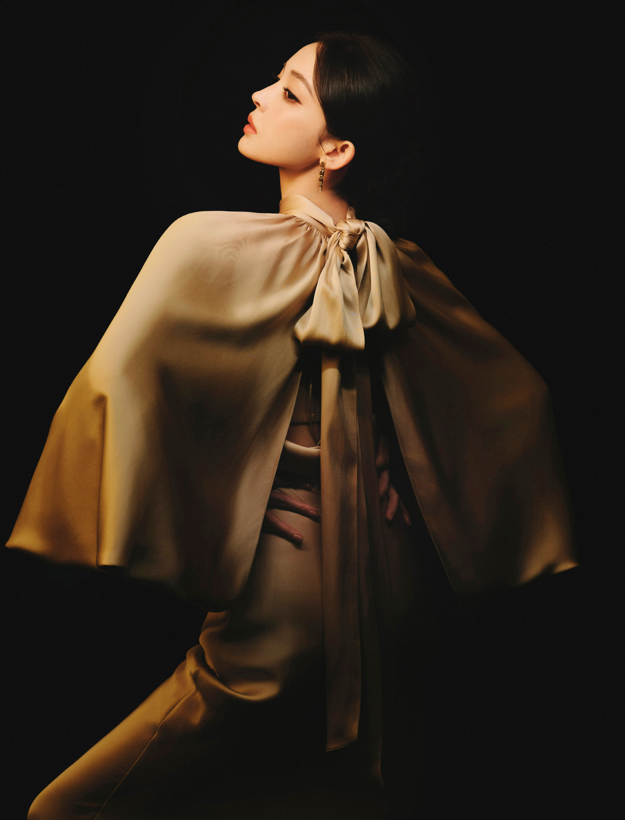 整套造型以香槟色缎面为核心载体,温润的低饱和金调自带柔光滤镜,在光影流转间泛着如酒液般细腻的光泽,恰如“打翻了一杯香槟,在暗里漫成轮廓”的诗意意境。两件式礼服的设计极具巧思:立领抽褶斗篷勾勒出松弛大气的轮廓,宽松灯笼袖弱化了凌厉感,胸前恰到好处的镂空设计,又在端庄之中藏住了分寸感十足的性感;内搭修身垂坠的吊带长裙,与外搭形成完美的松紧对比,后背的蝴蝶结设计,更在转身间露出不刻意的柔媚巧思。